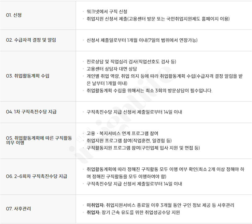 취업활동 계획을 세우고 실질적인 구직 노력을 기울이도록 의무를 부여하며, 계획에 따라 활동 내용을 철저히 점검합니다. 구직 의무를 성실히 이행한 경우에 한해 구직 촉진 수당을 지급하며, 의무를 양해하지 않을 경우 수당이 제한됩니다.