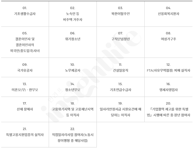 - 중장년 : 35세~69세 구직자 중 중위소득 100% 이하인 사람