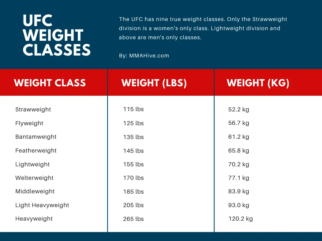 UFC는 시간이 지남에 따라 새로운 체급을 추가하거나 조정할 수 있으며, 각 체급에서 경쟁하는 선수들은 경기 전날 체중 측정을 통해 해당 체급의 체중 한계를 맞춰야 합니다. 체중 측정을 통과하지 못하면 경기에 참여할 수 없거나, 상대 선수와 합의 하에 비공식 경기로 치러지는 경우가 있습니다.